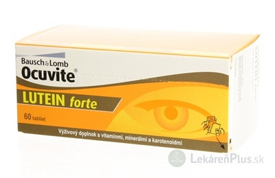 Ocuvite® LUTEIN forte obsahuje vitamín C 60mg, vitamín E 8,8mg, zinok 5mg, selén 20µg, 6mg luteínu a 0,5mg zeaxanthínu.