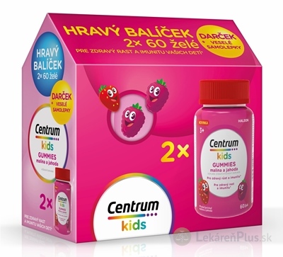 Centrum kids GUMMIES malina a jahoda (darčekové balenie) želé s vitamínmi a minerálmi 2x60 ks + darček: veselé samolepky, 1x1 set