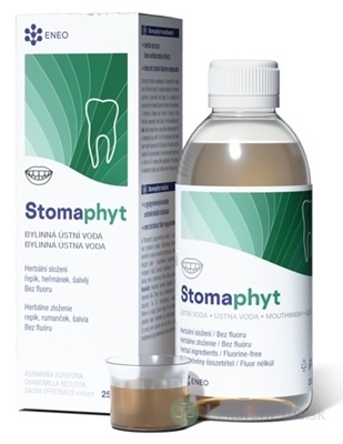 Bylinná ústna voda Stomaphyt je určená na každodennú starostlivosť o ústnu dutinu. Obsahuje extrakty repíka lekárskeho, rumančeka pravého a šalvie lekárskej. Je vhodná pre osoby so zvýšenou tvorbou povlaku, nositeľov zubných protéz, mostíkov a koruniek. Vyniká