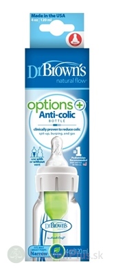 Dr.BROWN´S DOJČENSKÁ FĽAŠA OPTIONS+ 120 ml Narrow, 0M+, anti-colic, plastová, biela (so silikónovým cumľom level-1) 1x1 ks