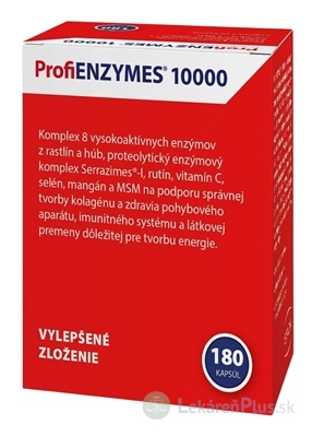 ProfiENZYMES® 10000 je enzýmový výživový doplnok obsahujúci zmes synergicky pôsobiacich enzýmov z rastlín a húb. Účinok 8 vysokoaktívnych enzýmov a proteolytického enzýmového komplexu Serrazimes®-I dopĺňa bioflavonoid rutín, vitamín C*, selén**, mangán*** a MSM.