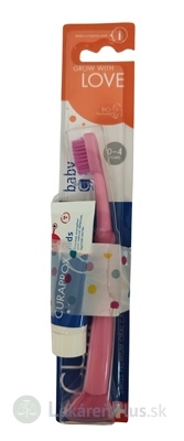 Detská detská zubná kefka pre deti vo veku 0 - 4 rokov + zubná pasta s ovocnou jahodovou príchuťou.
